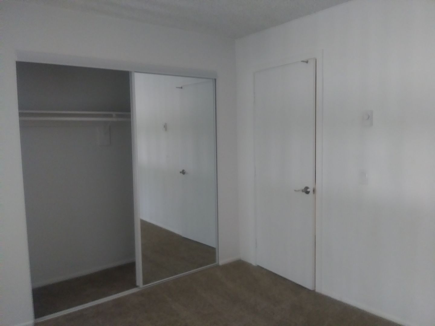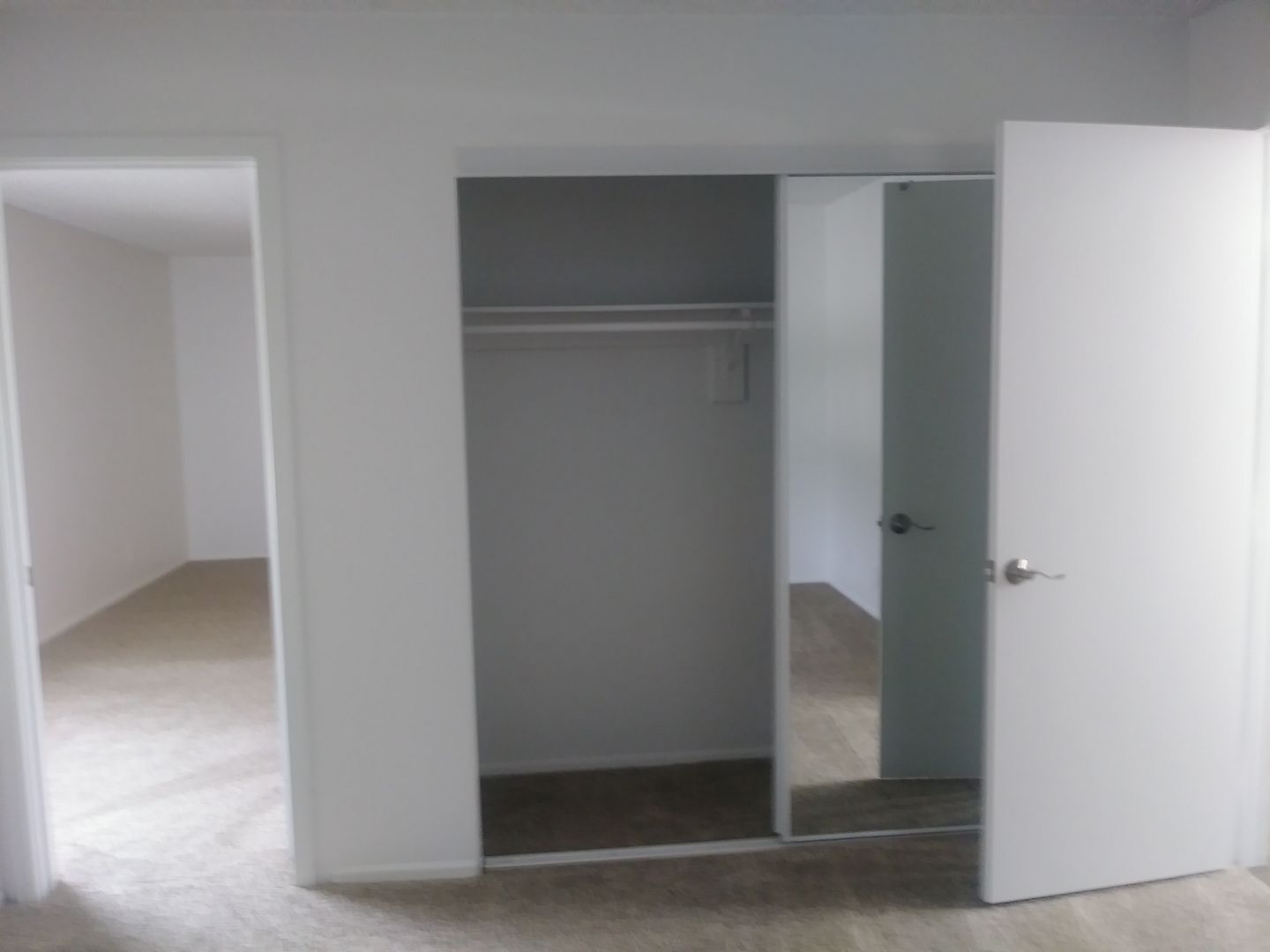The wall between the living room and bedroom is closed with a door between the bathroom and bedroom.