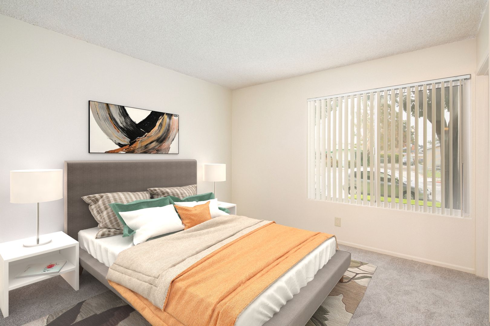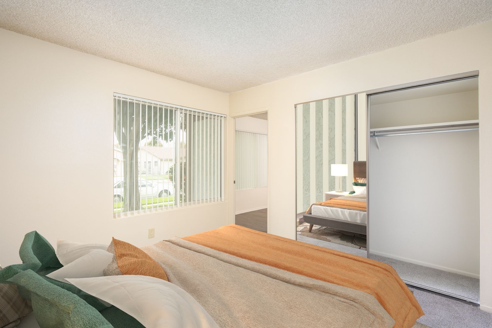 • Living space and bedroom have a large window and both with vertical blinds.